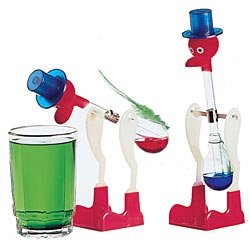 Drinking Bird A rather dumb looking 6 bird with a felt covered head and has plastic feet. Worse, he cannot get his fill of water. You buy the drinks. Fluid inside condenses from the evaporative cooling of the water off the bird's beak, making it top heavy and dunking it back into the water. The condensate rejoins the liquid pool in the bird's bulb, and he tips up again. Process continues indefinitely. It works, but it's not any more than moderately well made, and not any more than moderately priced. WARNING! The fluid and dye inside the bird can permanently stain, and the bird's glass body can easily be broken. Children are fascinated by the bobbing bird, and the educational possibilities are great. But they should watch it, not fondle it!!